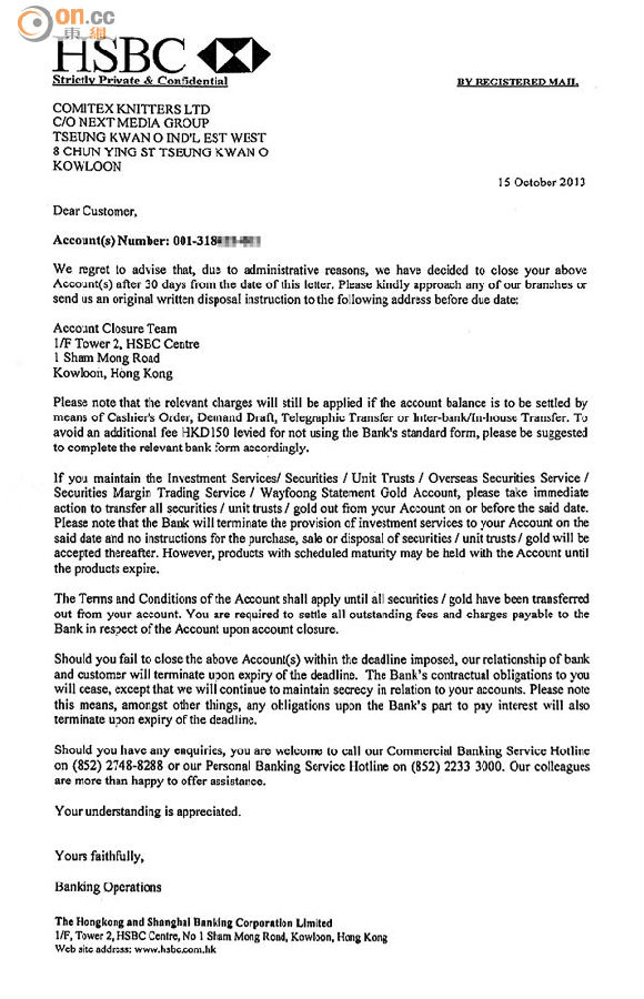 同年十月十五日、即在八月底的匯款完成約一個半月後,滙豐銀行突向以將軍澳壹傳媒總部作地址的公明織造廠發信,指該行已決定以「行政理由」(administrative reasons)取消該公司的銀行戶口,三十天後正式生效,促請該公司在限時內盡快提取戶口內資產,並將戶口的信託、投資指示等轉移至其他帳戶,而有關存取費用將由公明織造廠承擔,銀行一律不會負責。惟密件未有交代公明織造廠有否提出反對及在滙豐重開戶口,以及黎智英最終將資產轉往甚麼地方。