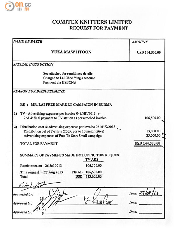 同年七月底及八月底,黎智英又透過該戶口,分兩次向Yuza Maw Htoon匯款共廿一萬美元、即約一百六十三萬港元,聲稱用作電視廣告費。換言之,黎智英在短短三個月內,透過公明織造廠在滙豐的戶口,向緬甸反對派人士合共匯款逾三百三十萬元,比起今年他向前政務司司長陳方安生「加碼」捐出的三百萬元還多出一成。