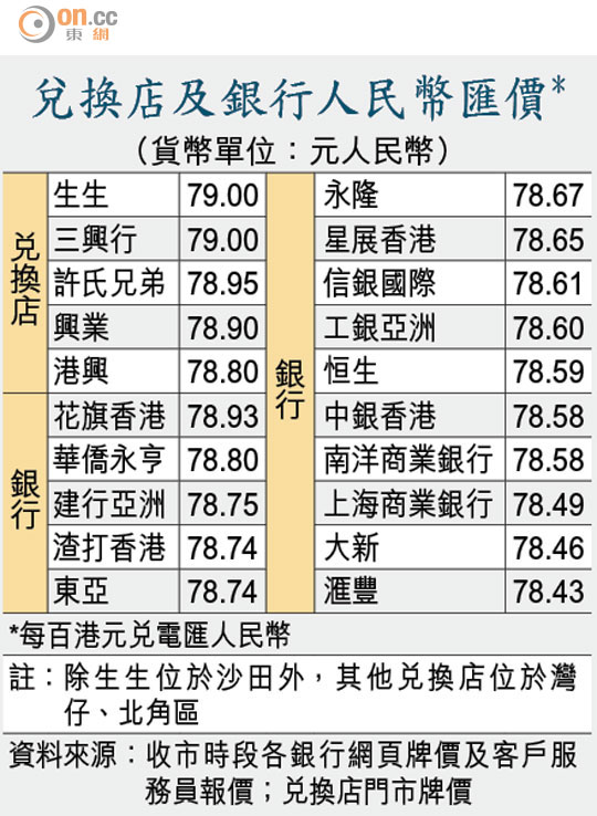 銀行電匯價方面,根據收市時段各銀行網頁牌價及客戶服務員報價,於花旗香港兌人民幣最抵,一百港元可兌換成78.93元人民幣,逼近兌換店匯價,其次是華僑永亨的每百港元兌78.8元人民幣。