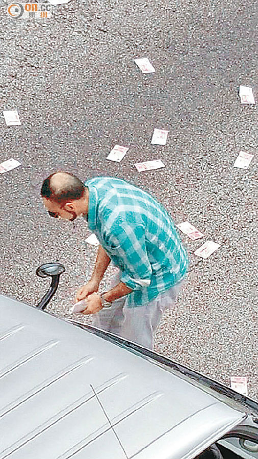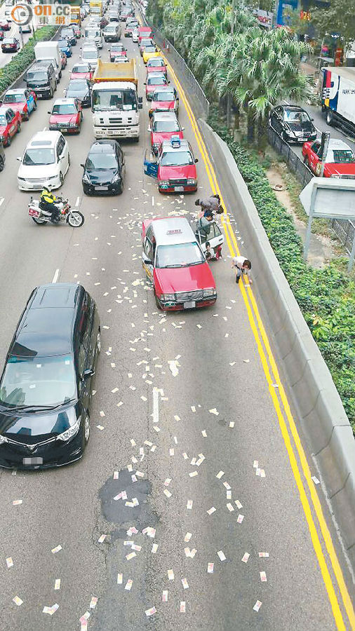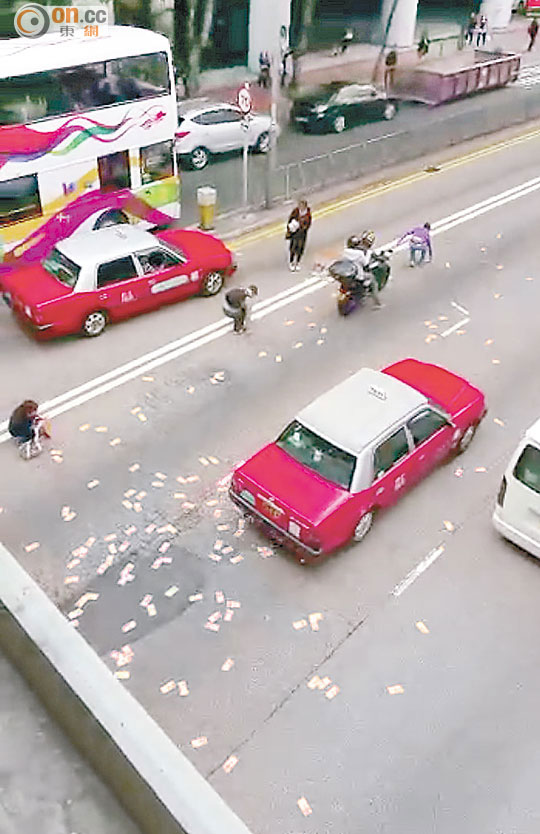 ■鈔票散布一地,有人索性落車執錢。(讀者提供)
