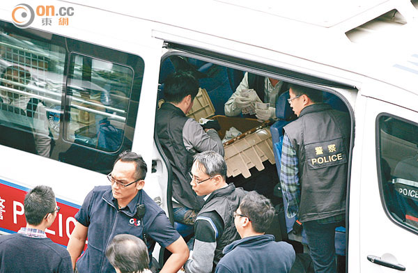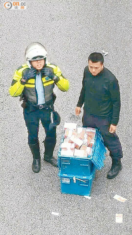 ■撿回的鈔票放回膠箱,警員在旁看管。(讀者提供)