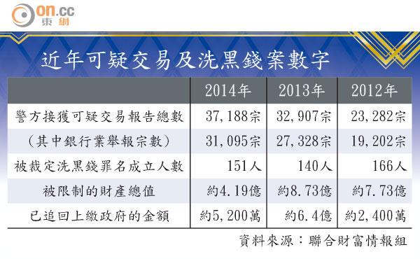 另外,一二年四月《打擊洗錢及恐怖分子資金籌集(金融機構)條例》在本港生效,警方接獲的可疑交易報告近三年亦劇增,一二年共收到二萬三千宗,一三年達到三萬二千宗,去年有三萬七千一百八十八宗,較前年增逾一成六,平均每日接獲逾一百宗,其中來自銀行的可疑交易報告佔整體報告近八成。